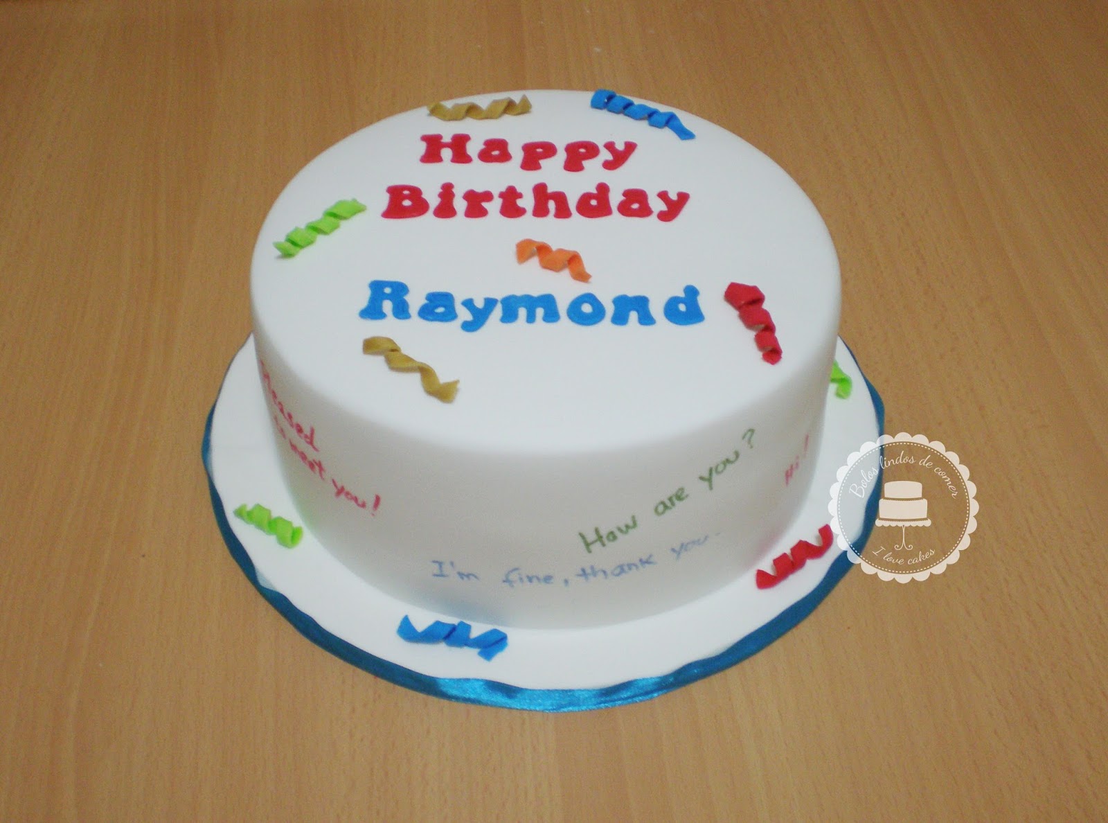 Bolo alegre e colorido para o divertido professor de inglês. Decorações em pasta de açúcar e caneta de tinta comestível.